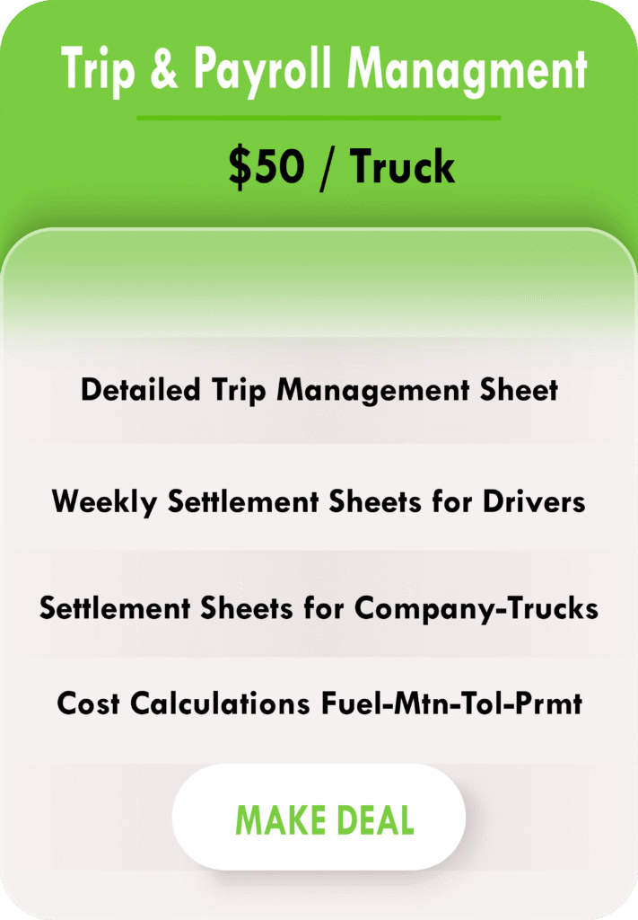 Manage your trip management and settlement processes with our dedicated services. In our Trip Management & Driver Settlements package, we create detailed trip management sheets for carriers, recording every load’s details, driver information, trucks, and equipment specifics. For drivers, we prepare precise weekly settlement sheets, calculating miles, revenue, fuel consumption, and more. Our comprehensive truck settlement sheets for company-owned trucks cover all costs, including driver pay, fuel consumption, maintenance, and over-the-road permits.